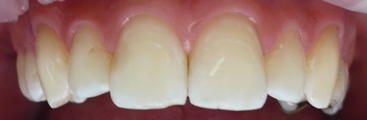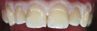 Kredaste lise na zgornjih sprednjih zobeh kot posledica nošenja ortodontskega aparata. Na obzobni dlesni je bela zaščita.