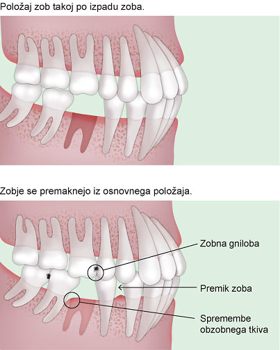 Izguba enega ali več zob povzroči zmanjšanje žvečne površine, sočasno pa lahko pride do nagibanja zob v vrzel ali do izraščanja zob nasprotnega zobnega loka v vrzel. Taka nepravilna lega otežuje čiščenje zob in omogoča zastajanje ostankov hrane, zato je večja verjetnost nastanka zobne gnilobe in tudi večja dovzetnost za obolenje obzobnih tkiv. To lahko vodi tudi v nepravilne gibe spodnje čeljusti zaradi česar lahko pride do težav s čeljustnim sklepom. Pri večjem številu manjkajočih zob lahko pride do povečane obrabe preostalih zob.