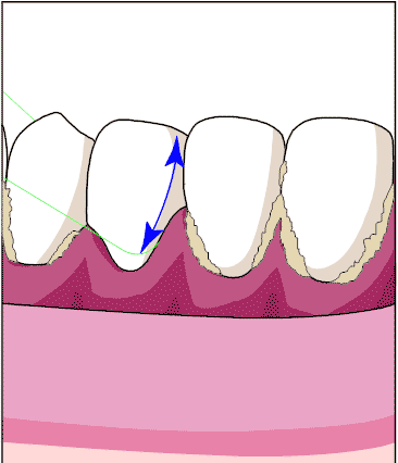 - Ko se z nitko dotaknete dlesni ob zobnem vratu, jo upognite v obliki črke C, tako bo sama zdrsela v dlesnin žleb med zobom in dlesnijo.